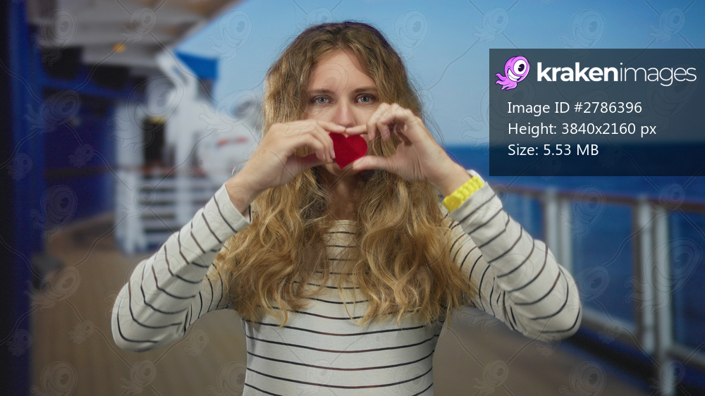 Woman holds a heart while smiling aboard a ship, her blonde young appearance on the deck beside the ocean during a cruise to celebrate love.