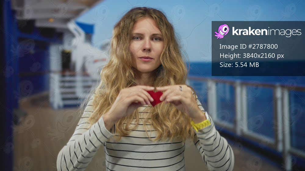 Woman holds a heart while smiling aboard a ship, her blonde young appearance on the deck beside the ocean during a cruise to celebrate love.