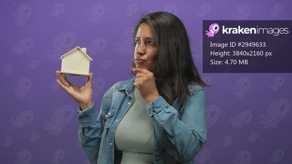 Woman holds a miniature wooden house in one hand and touches her chin with finger in studio; contemplation decision.