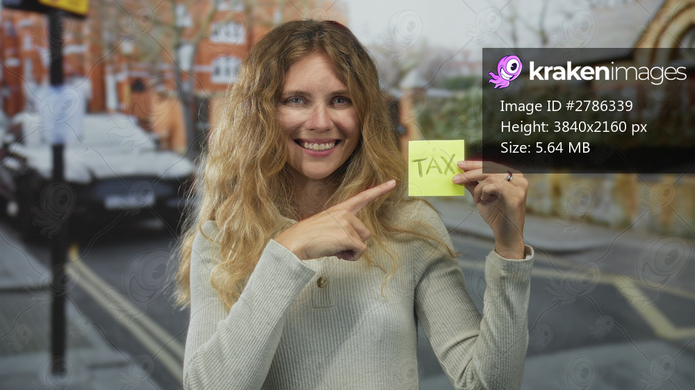 Woman holds a note while pointing on a street to illustrate tax, smiling with blonde hair and young face and hand raised outdoors.