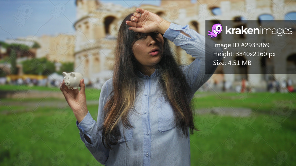 Woman holds a piggy bank in one hand and raises her other hand to forehead in building near coliseum; worry.