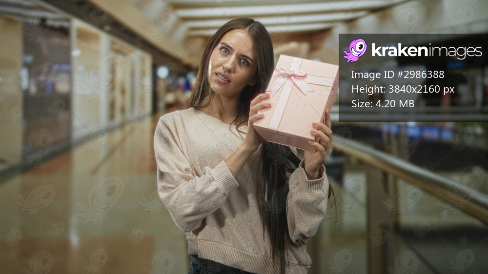 Woman holds a pink gift box to her ear, tilts and lightly shakes it while frowning beside a glass railing on an airport concourse; puzzlement.