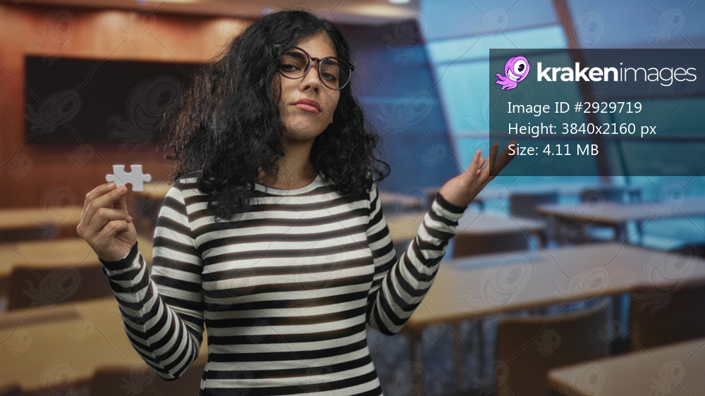 Woman holds a puzzle piece and shrugs with one hand raised while the other touches her chest in a classroom building; reflection uncertainty.
