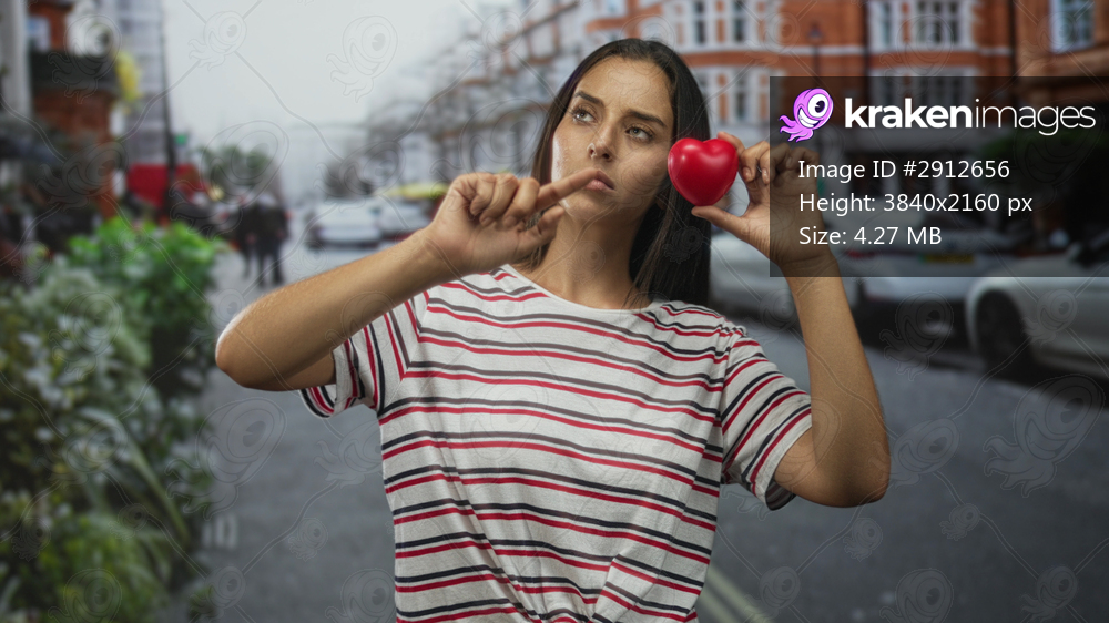 Woman holds a red heart and points finger to it on a busy city street wearing a striped tshirt and serious expression; romantic doubt.