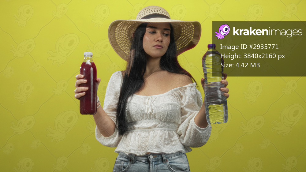 Woman holds a red juice bottle and a clear water bottle with hands extended, shoulders bare in studio while weighing drinks; contemplative choice.