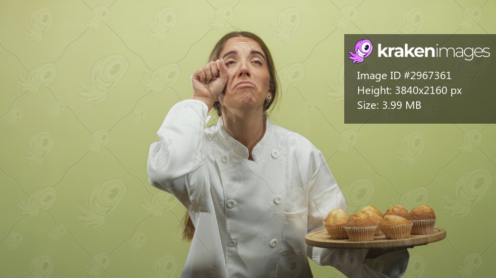 Woman holds a tray of muffins in a studio wearing chef uniform and rubbing her eye while offering baked goods; tired.