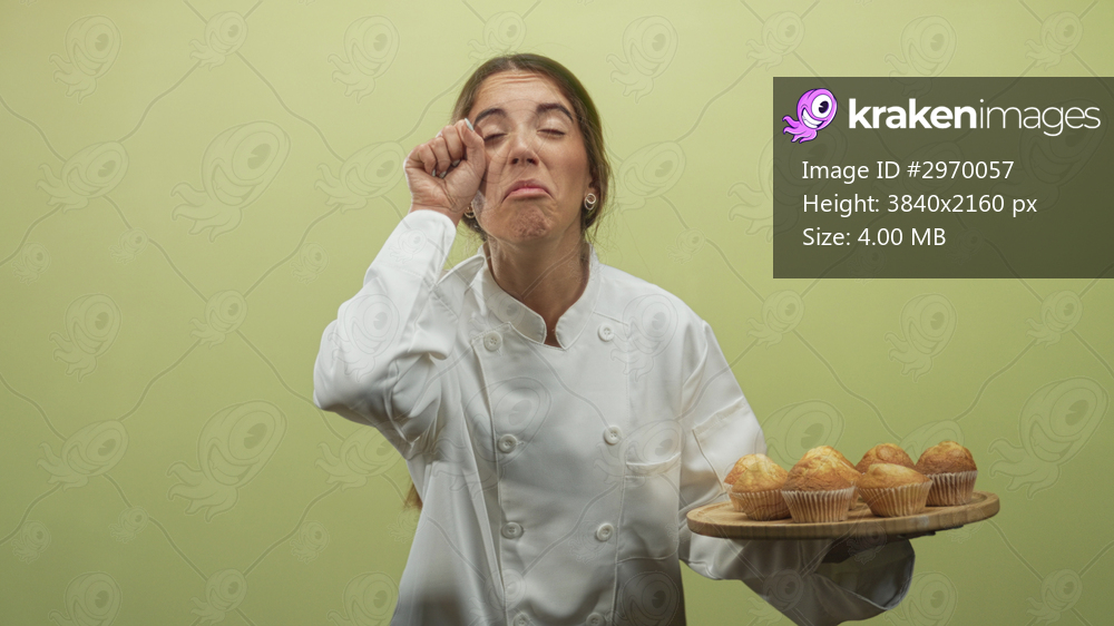 Woman holds a tray of muffins in a studio wearing chef uniform and rubbing her eye while offering baked goods; tired.