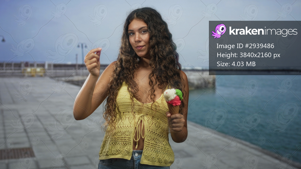Woman holds a triple scoop ice cream cone and extends her hand in an offering gesture on a seaside pier near the water; summer leisure playful.