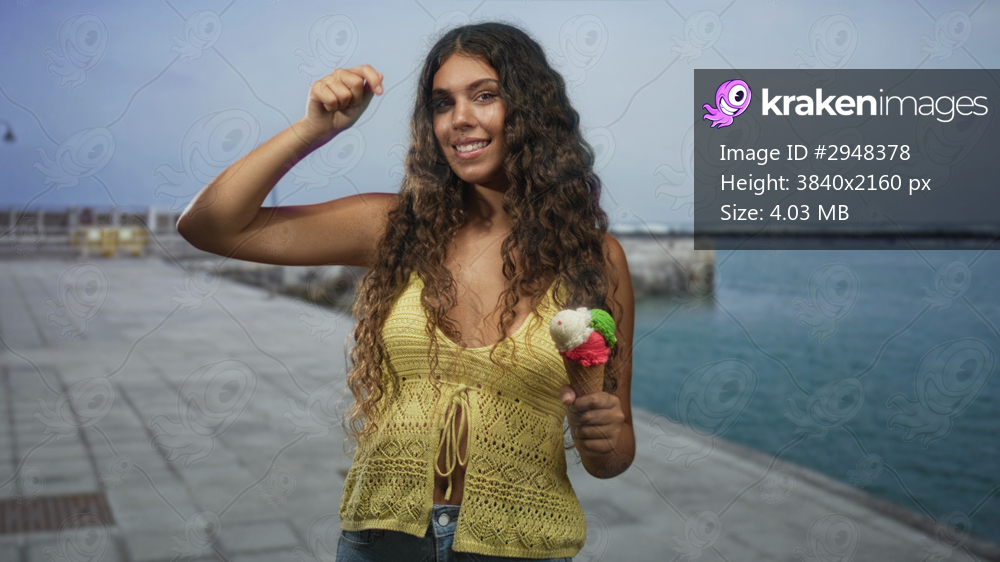 Woman holds a triple scoop ice cream cone and extends her hand in an offering gesture on a seaside pier near the water; summer leisure playful.