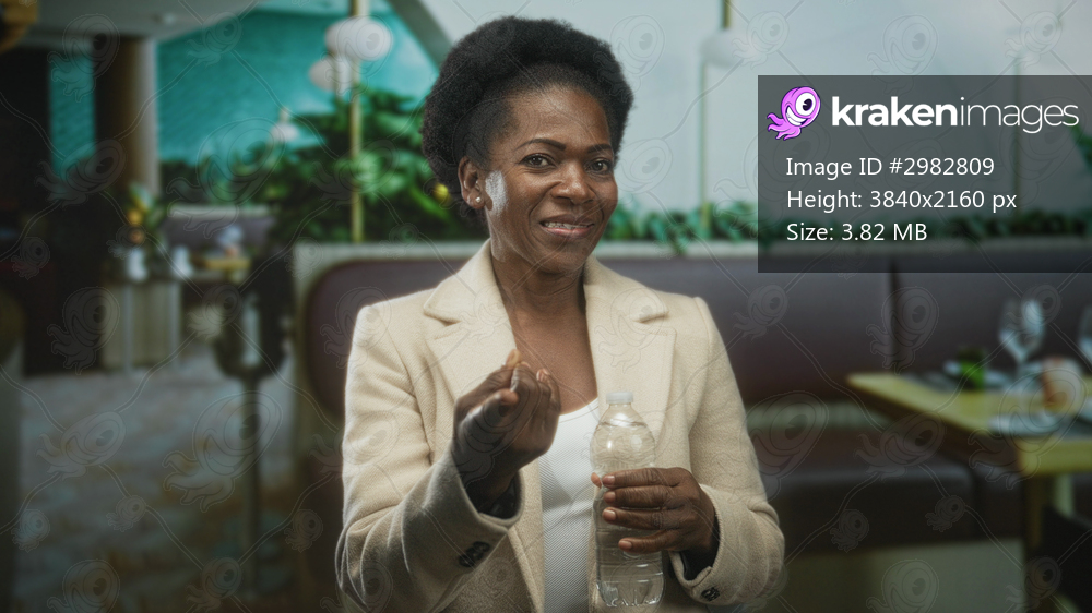 Woman holds a water bottle and beckons with her finger in a building dining area, smiling gently while gripping the bottle; friendly invitation.