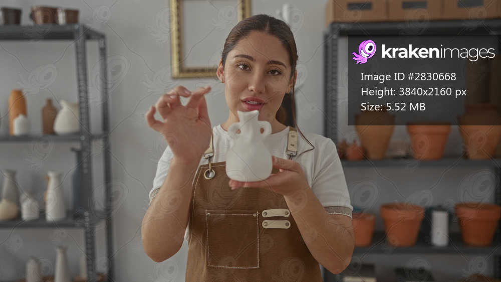 Woman holds a white ceramic vase and uses her hand to explore its textured surface in a workshop; creativity.