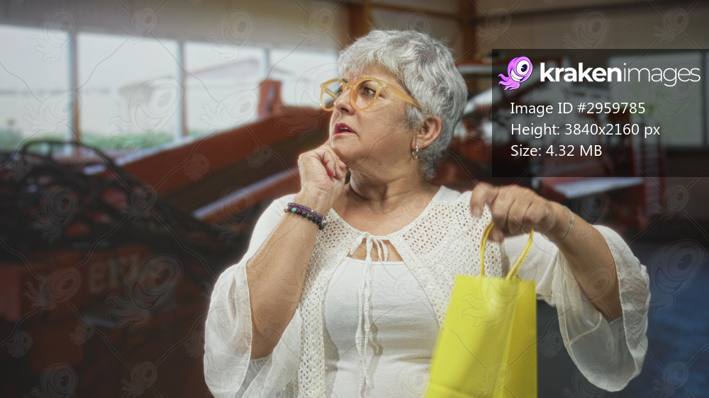 Woman holds a yellow shopping bag and rests chin on hand in a building workshop with large farm machinery and windows; skepticism thrift decisions.