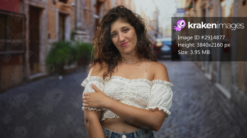 Woman holds arm across chest showing shoulder and pearl necklace on cobblestone street; quiet contemplation.