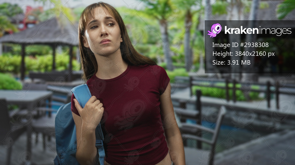 Woman holds backpack strap at resort poolside with closed eyes and hand gripping the blue strap near shoulder; quiet uncertainty.