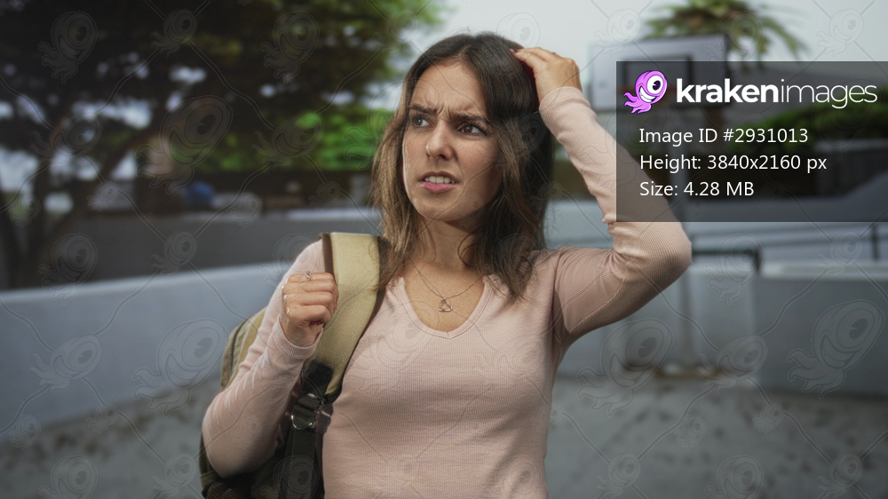 Woman holds backpack strap with hand to head at building basketball court; confusion uncertainty decision.