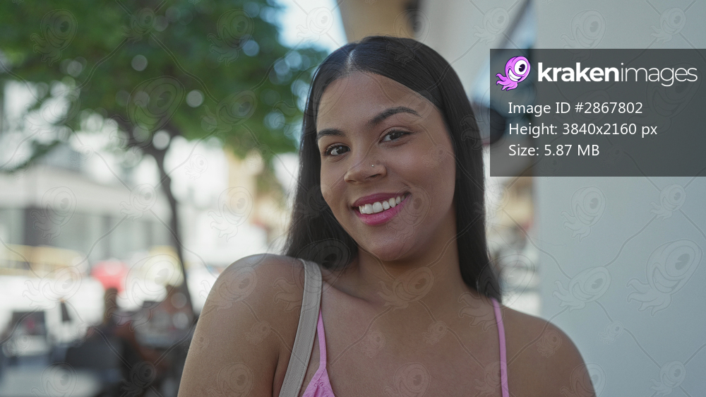 Woman holds bag strap in pink top while smiling at camera on street; self expression joy confidence.