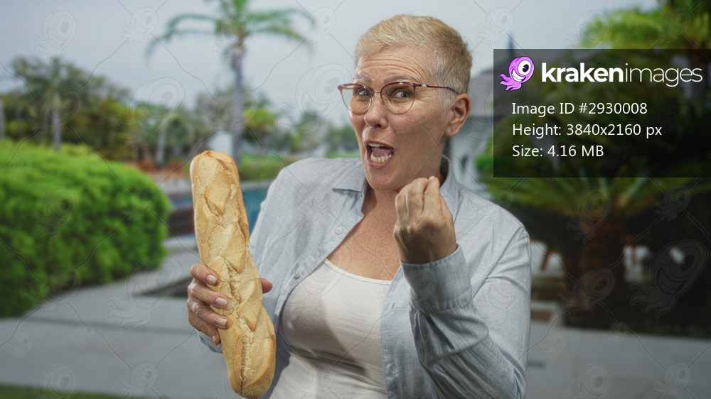 Woman holds baguette with visible hand and makes fist gesture in building poolside resort; celebration joy.