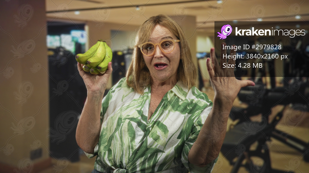 Woman holds bananas with left hand and shows open right hand five fingers in a building gym; playful vitality.