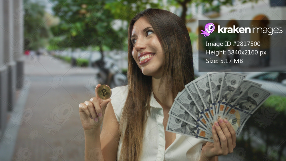 Woman holds bitcoin coin and a fanned stack of dollars while smiling on city street; financial success.