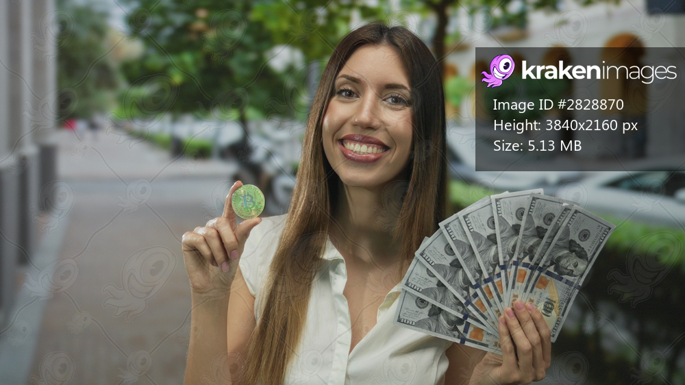Woman holds bitcoin coin and a fanned stack of dollars while smiling on city street; financial success.