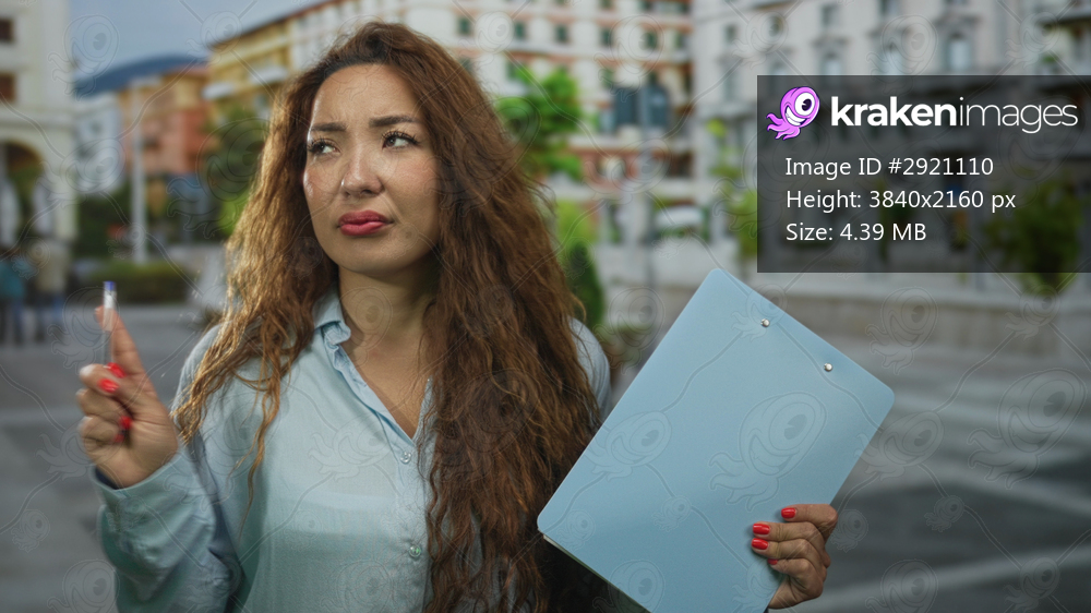 Woman holds blue clipboard and pen on a city street, raises pen with a skeptical frown and pursed lips; skepticism.