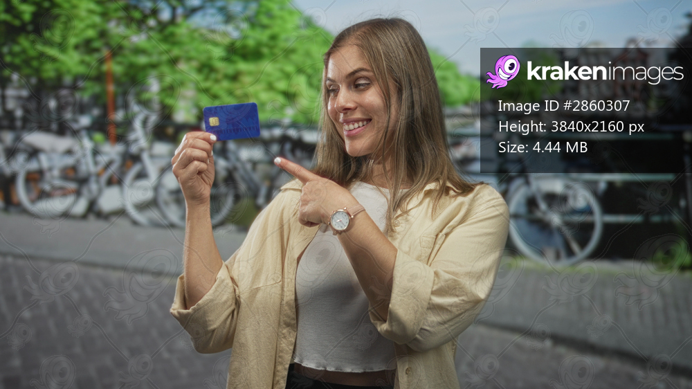 Woman holds blue creditcard and points finger to it on street; payment convenience confidence security.