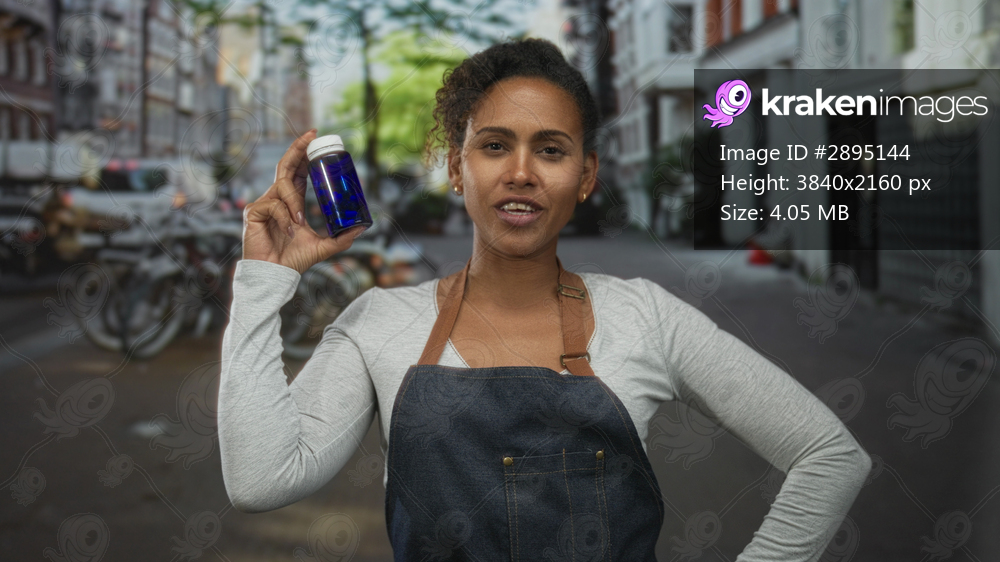 Woman holds blue glass bottle with right hand at chest level wearing denim apron on a city street with parked bicycles and buildings; confidence wellness local business. - Kraken Images