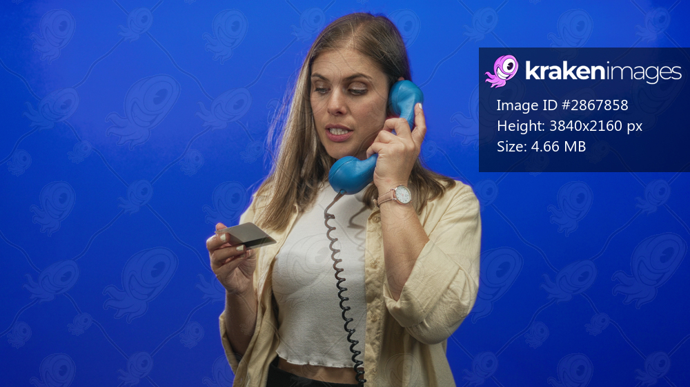 Woman holds blue handset to ear and examines a credit card while leaning against studio wall; curiosity insight.