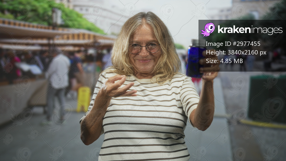 Woman holds blue medicine bottle in outstretched hand at busy outdoor market stall, smiling and presenting pills; wellness comfort.