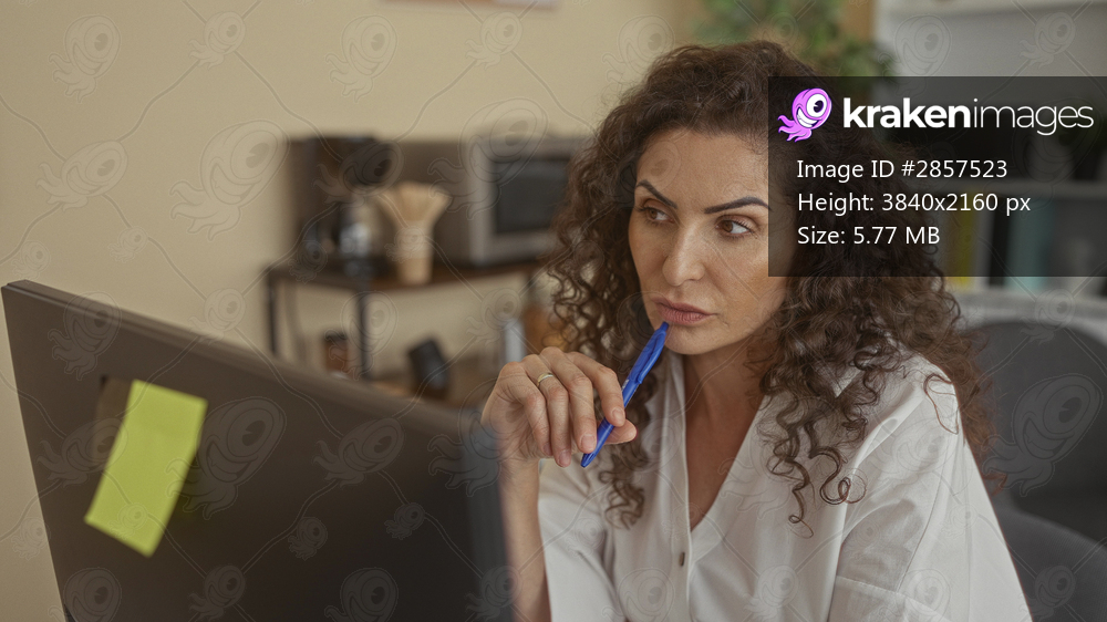 Woman holds blue pen to chin while seated at desk in building interior looking at computer screen; quiet contemplation.