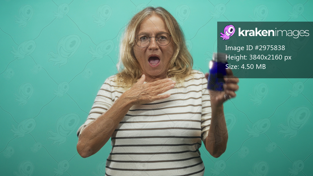 Woman holds blue pill bottle with hand on chest and open mouth presenting medicine in studio; health concern.