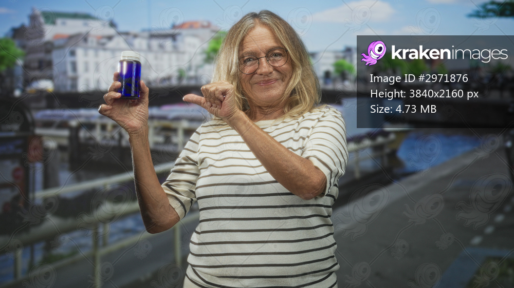Woman holds blue pill bottle in left hand while showing a small gap with thumb and forefinger on a street; health confidence.