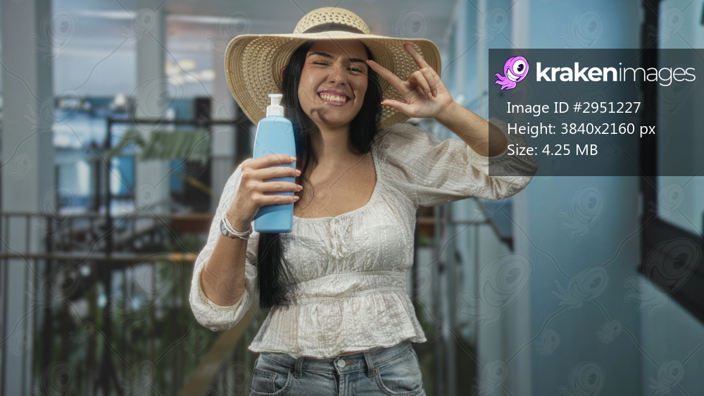 Woman holds blue pump sunscreen bottle, smiling and hand makes rock sign near railing in modern building corridor; vacation joy.