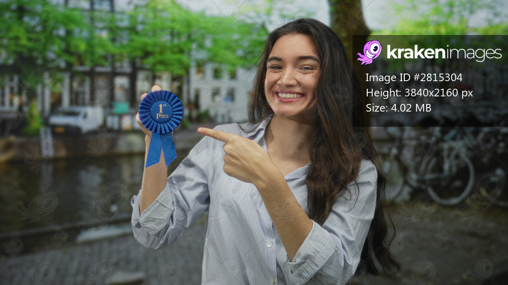 Woman holds blue ribbon and points finger to ribbon on street while smiling broadly; achievement celebration victory pride.