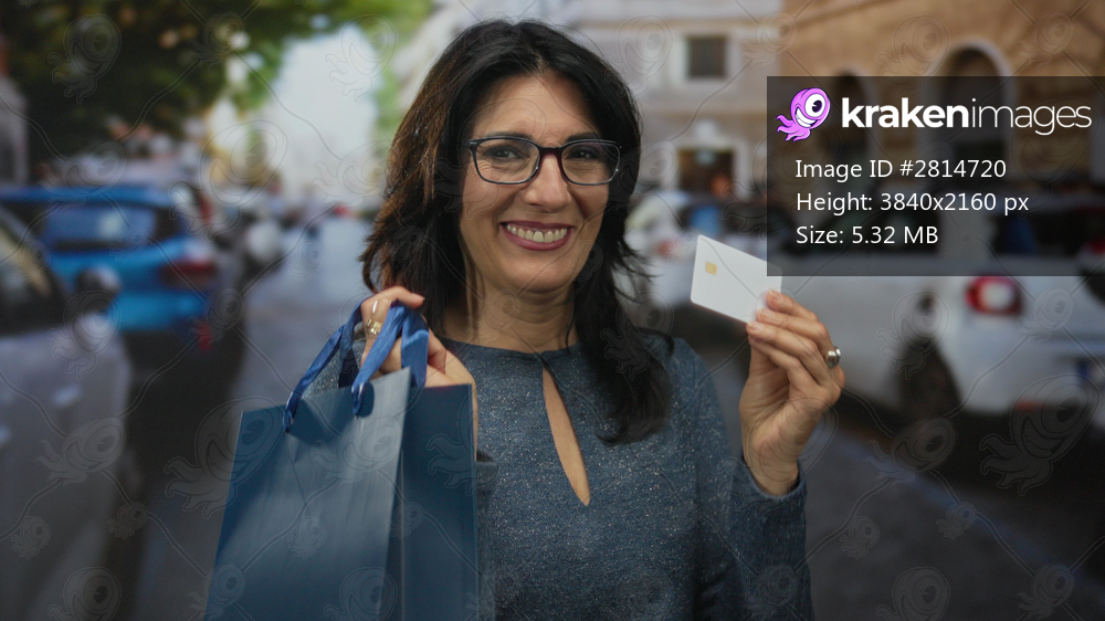 Woman holds blue shopping bag and white creditcard on bustling urban street; retail therapy happiness.