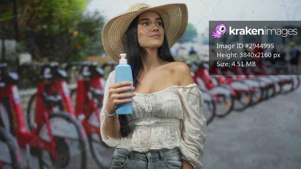 Woman holds blue sunscreen bottle at chest, bare shoulder visible, tilts head with closed eyes on street by bike share station; sun care serenity.