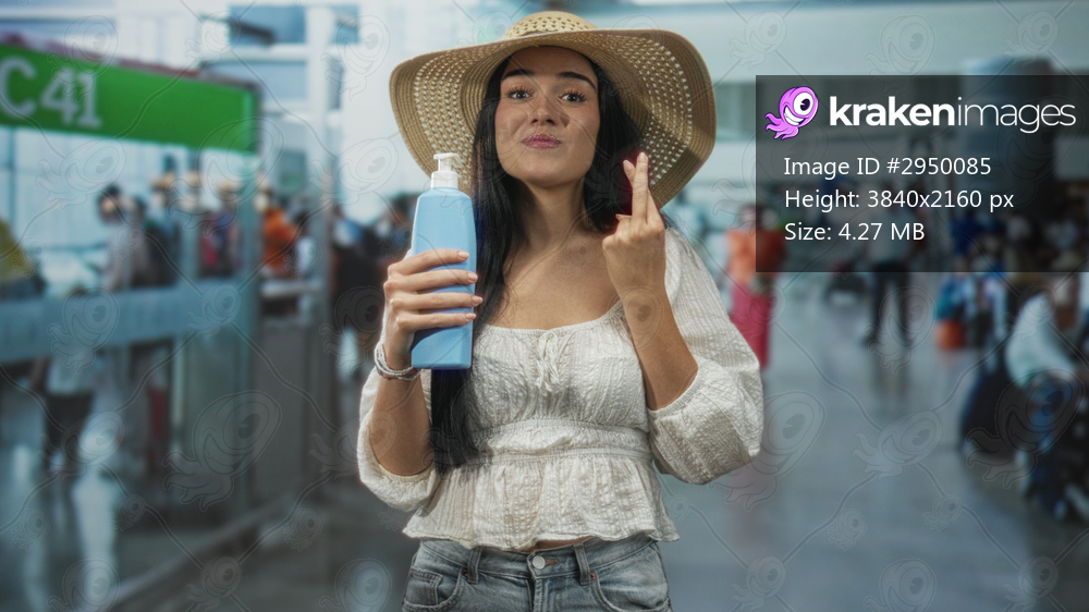 Woman holds blue sunscreen bottle and shows middle finger at airport gate while wearing straw sun hat and casual white top; defiance.