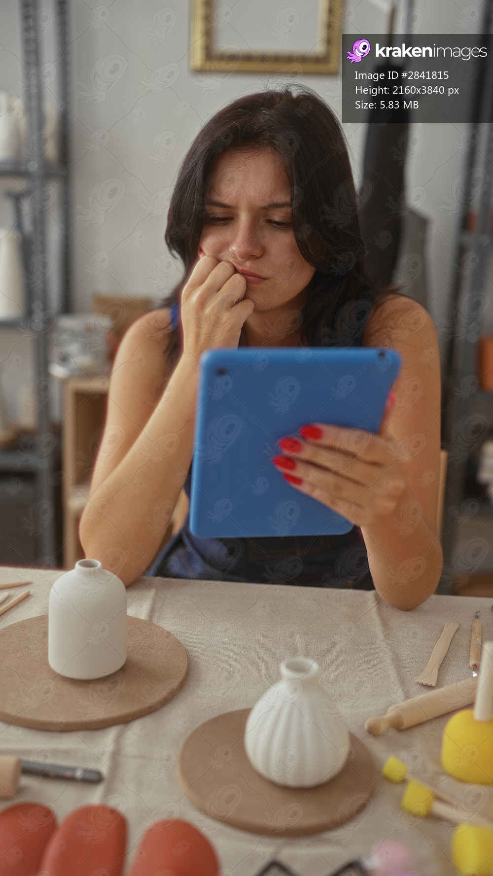 Woman holds blue tablet at pottery worktable surrounded by ceramic vases and sculpting tools in studio; frustration.