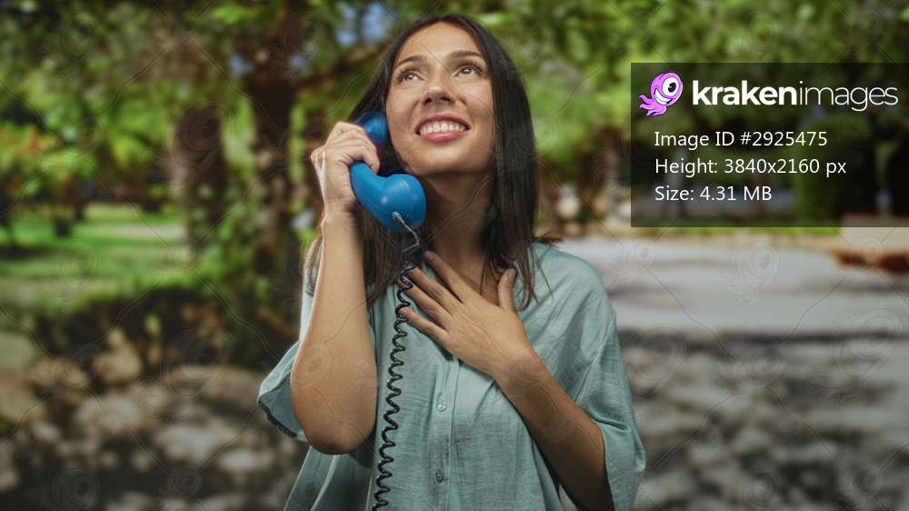 Woman holds blue telephone receiver to ear while hand rests over chest in park; gratitude connection.