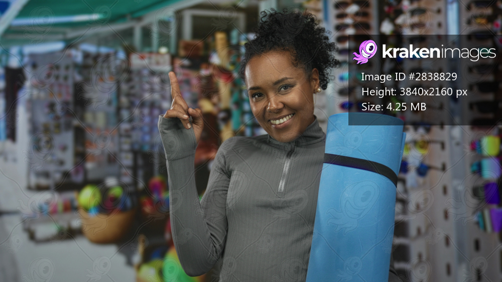 Woman holds blue yoga mat and smiles while pointing finger in street market; confidence discovery ambition.