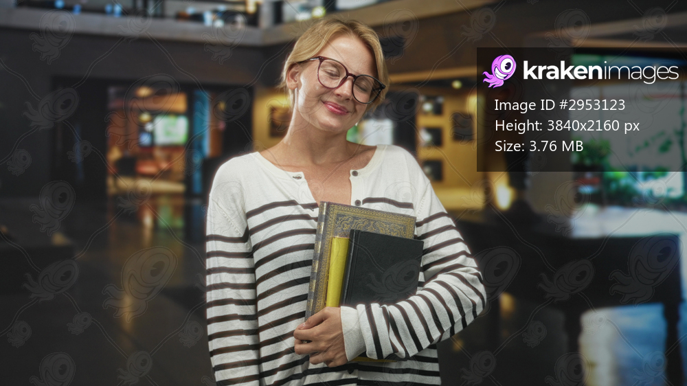 Woman holds books to chest with head tilt and closed-eyes smile in a modern building lobby with piano and seating; contentment.