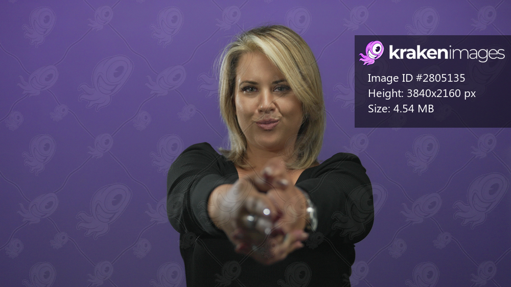 Woman holds both hands as finger gun while making subtle direct eye contact in purple studio; confidence.