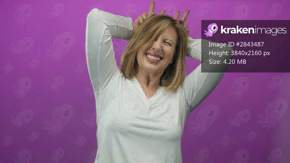 Woman holds both hands behind head making bunny ears gesture against purple studio wall; playfulness.