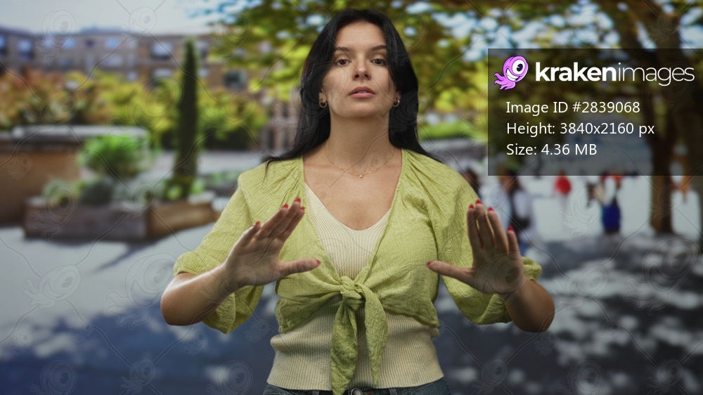 Woman holds both hands up in a calming gesture on a busy pedestrian street in early morning; serenity.