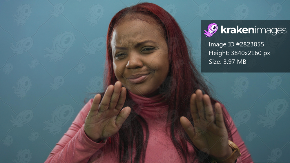 Woman holds both palms forward at shoulder height in studio with blue backdrop signaling refusal; boundary resistance defiance.