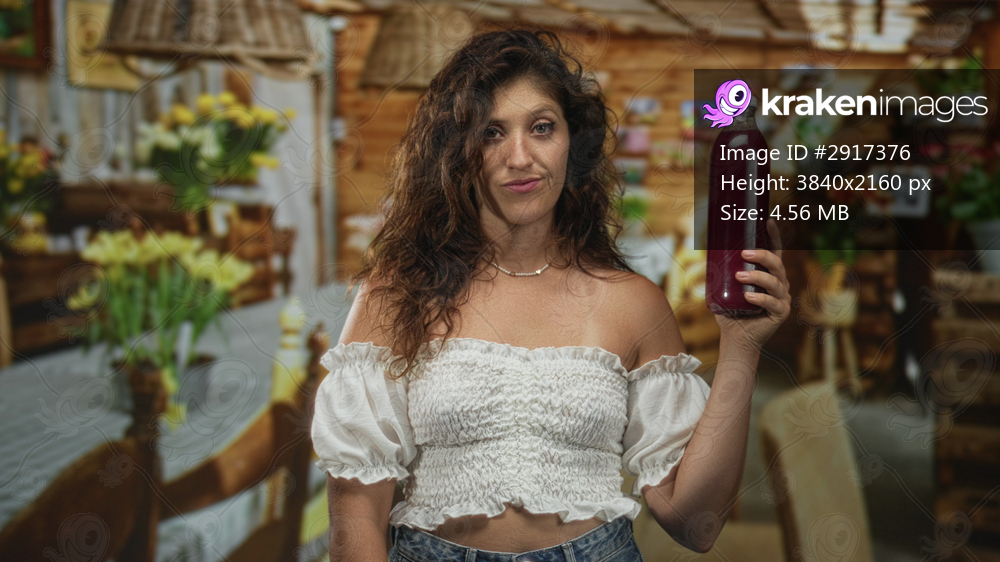 Woman holds bottle by hand with bare shoulders visible in restaurant interior, juice bottle raised at chest height; skepticism curiosity.