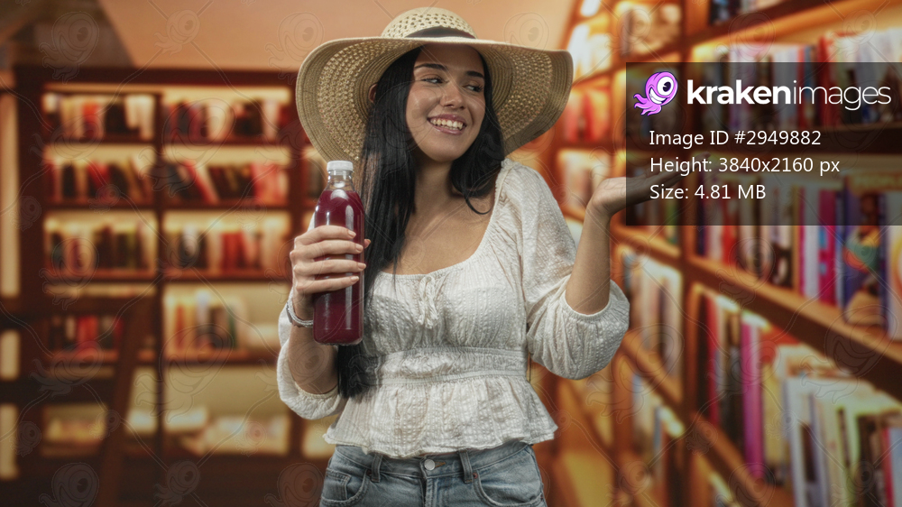 Woman holds bottle in one hand with palm up gesture, straw sunhat and white blouse in a bookstore inside a building; casual cheerfulness.
