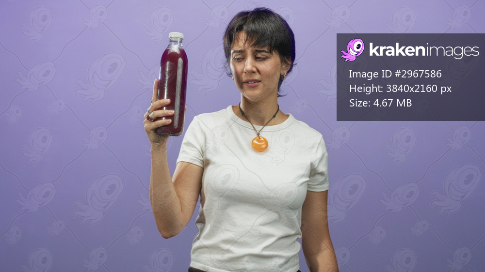 Woman holds bottle of pomegranate juice in hand, raises it up while frowning and inspecting the liquid in a studio; skepticism.