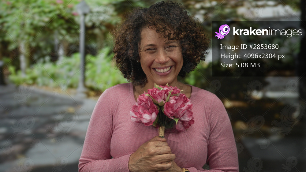 Woman holds bouquet of pink peony flowers on sunlit park walkway surrounded by lush green foliage; happiness.