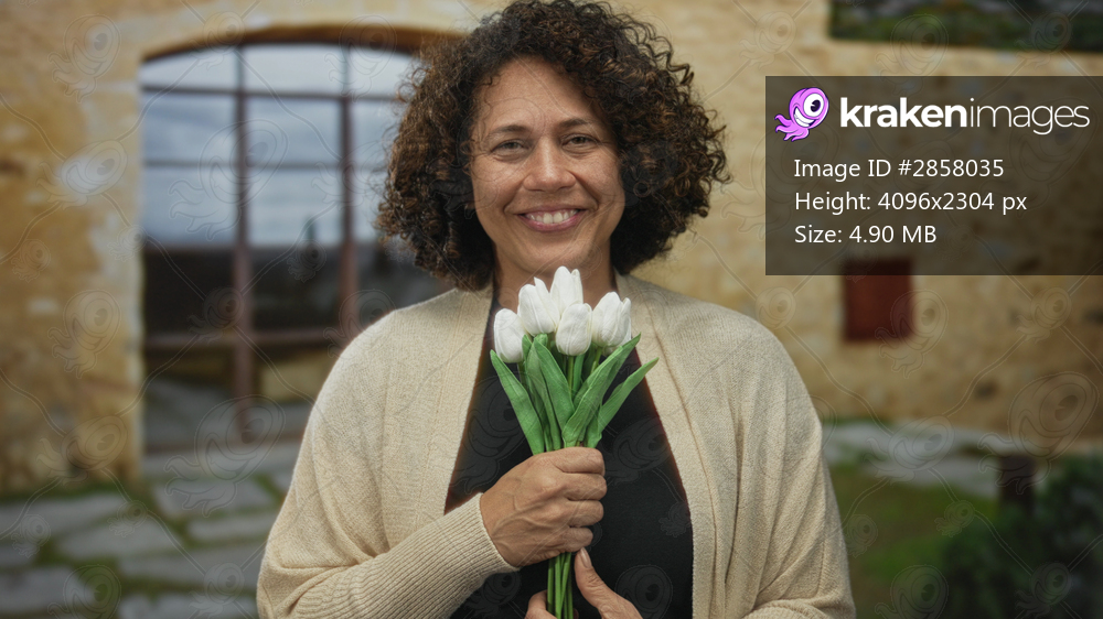 Woman holds bouquet of white tulips at building entrance while smiling gently with closed eyes; serenity.